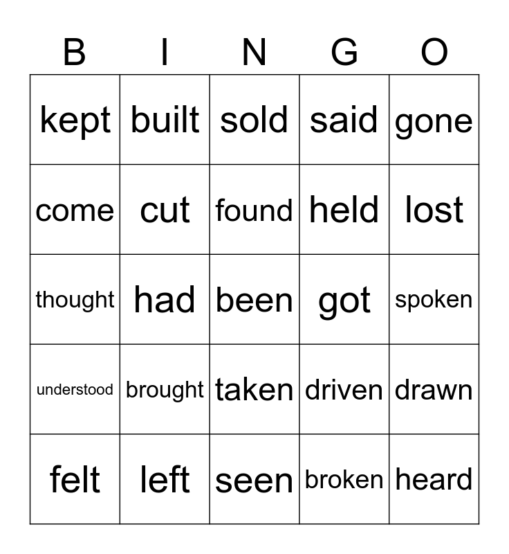This bingo card has 53 words: Free!, been, begun, broken, brought, bought, built, chosen, come, cost, cut, done, drawn, driven, eaten, felt, found, got, given, gone, had, heard, held, kept, known, left, led, let, lain, lost, made, meant, met, paid, put, run, said, seen, sold, sent, set, sat, spoken, spent, stood, taken, taught, told, thought, understood, worn, won and written.