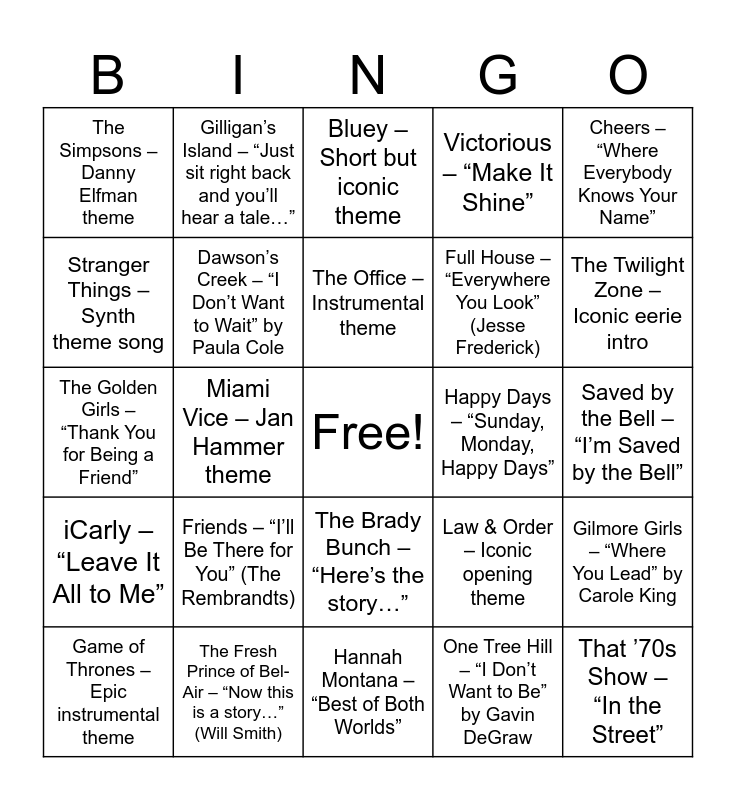 This bingo card has a free space and 24 words: Friends – “I’ll Be There for You” (The Rembrandts), The Fresh Prince of Bel-Air – “Now this is a story…” (Will Smith), The Office – Instrumental theme, Game of Thrones – Epic instrumental theme, Cheers – “Where Everybody Knows Your Name”, The Simpsons – Danny Elfman theme, Stranger Things – Synth theme song, Gilligan’s Island – “Just sit right back and you’ll hear a tale…”, Happy Days – “Sunday, Monday, Happy Days”, The Brady Bunch – “Here’s the story…”, Full House – “Everywhere You Look” (Jesse Frederick), The Golden Girls – “Thank You for Being a Friend”, Law & Order – Iconic opening theme, Gilmore Girls – “Where You Lead” by Carole King, Dawson’s Creek – “I Don’t Want to Wait” by Paula Cole, One Tree Hill – “I Don’t Want to Be” by Gavin DeGraw, Saved by the Bell – “I’m Saved by the Bell”, Bluey – Short but iconic theme, The Twilight Zone – Iconic eerie intro, Miami Vice – Jan Hammer theme, That ’70s Show – “In the Street”, iCarly – “Leave It All to Me”, Victorious – “Make It Shine” and Hannah Montana – “Best of Both Worlds”.