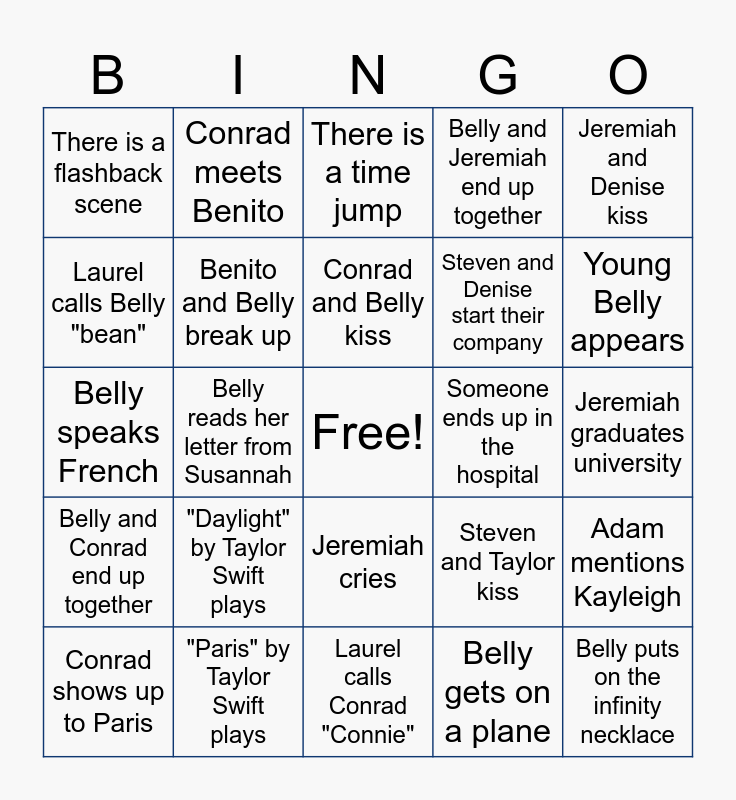This bingo card has a free space and 24 words: "Daylight" by Taylor Swift plays, "Paris" by Taylor Swift plays, Conrad and Belly kiss, Conrad shows up to Paris, Jeremiah and Denise kiss, There is a flashback scene, Laurel calls Belly "bean", Conrad meets Benito, Someone ends up in the hospital, Jeremiah cries, Steven and Denise start their company, Belly speaks French, Steven and Taylor kiss, Adam mentions Kayleigh, Benito and Belly break up, Belly gets on a plane, Jeremiah graduates university, There is a time jump, Young Belly appears, Belly reads her letter from Susannah, Belly puts on the infinity necklace, Belly and Conrad end up together, Belly and Jeremiah end up together and Laurel calls Conrad "Connie".