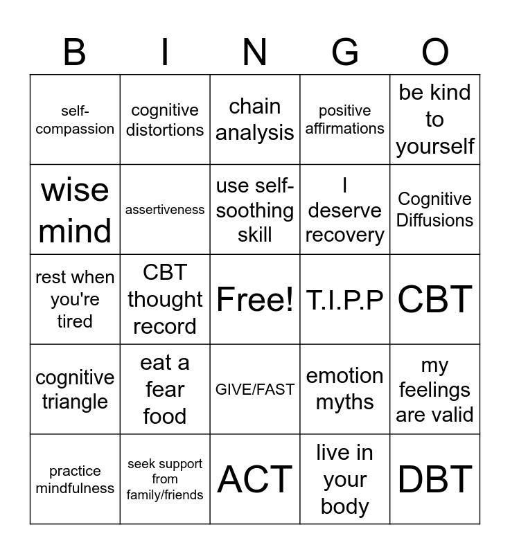 This bingo card has a free space and 24 words: eat a fear food, seek support from family/friends, use self-soothing skill, practice mindfulness, be kind to yourself, self-compassion, wise mind, cognitive distortions, T.I.P.P, GIVE/FAST, I deserve recovery, rest when you're tired, emotion myths, my feelings are valid, assertiveness, live in your body, CBT, chain analysis, Cognitive Diffusions, CBT thought record, DBT, cognitive triangle, positive affirmations and ACT.