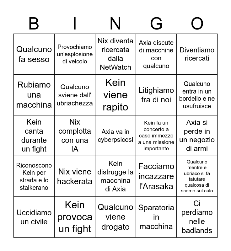 This bingo card has a free space and 24 words: Nix viene hackerata, Kein provoca un fight, Kein viene rapito, Uccidiamo un civile, Diventiamo ricercati, Qualcuno fa sesso, Rubiamo una macchina, Provochiamo un'esplosione di veicolo, Kein fa un concerto a caso immezzo a una missione importante, Kein distrugge la macchina di Axia, Litighiamo fra di noi, Kein canta durante un fight, Facciamo incazzare l'Arasaka, Qualcuno mentre è ubriaco si fa tatutare qualcosa di scemo sul culo, Qualcuno sviene dall' ubriachezza, Sparatoria in macchina, Axia si perde in un negozio di armi, Nix diventa ricercata dalla NetWatch, Qualcuno entra in un bordello e ne usufruisce, Nix complotta con una IA, Ci perdiamo nelle badlands, Riconoscono Kein per strada e lo stalkerano, Axia discute di macchine con qualcuno and Qualcuno viene drogato.