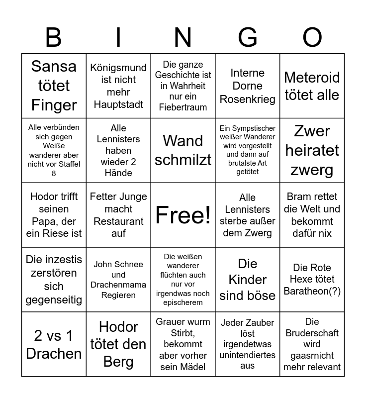 This bingo card has a free space and 24 words: John Schnee und Drachenmama Regieren, Hodor tötet den Berg, Wand schmilzt, 2 vs 1 Drachen, Meteroid tötet alle, Sansa tötet Finger, Alle verbünden sich gegen Weiße wanderer aber nicht vor Staffel 8, Königsmund ist nicht mehr Hauptstadt, Alle Lennisters sterbe außer dem Zwerg, Die weißen wanderer flüchten auch nur vor irgendwas noch epischerem, Ein Sympstischer weißer Wanderer wird vorgestellt und dann auf brutalste Art getötet, Hodor trifft seinen Papa, der ein Riese ist, Die Kinder sind böse, Die Rote Hexe tötet Baratheon(?), Alle Lennisters haben wieder 2 Hände, Jeder Zauber löst irgendetwas unintendiertes aus, Bram rettet die Welt und bekommt dafür nix, Die ganze Geschichte ist in Wahrheit nur ein Fiebertraum, Zwer heiratet zwerg, Fetter Junge macht Restaurant auf, Die Bruderschaft wird gaasrnicht mehr relevant, Die inzestis zerstören sich gegenseitig, Interne Dorne Rosenkrieg and Grauer wurm Stirbt, bekommt aber vorher sein Mädel.
