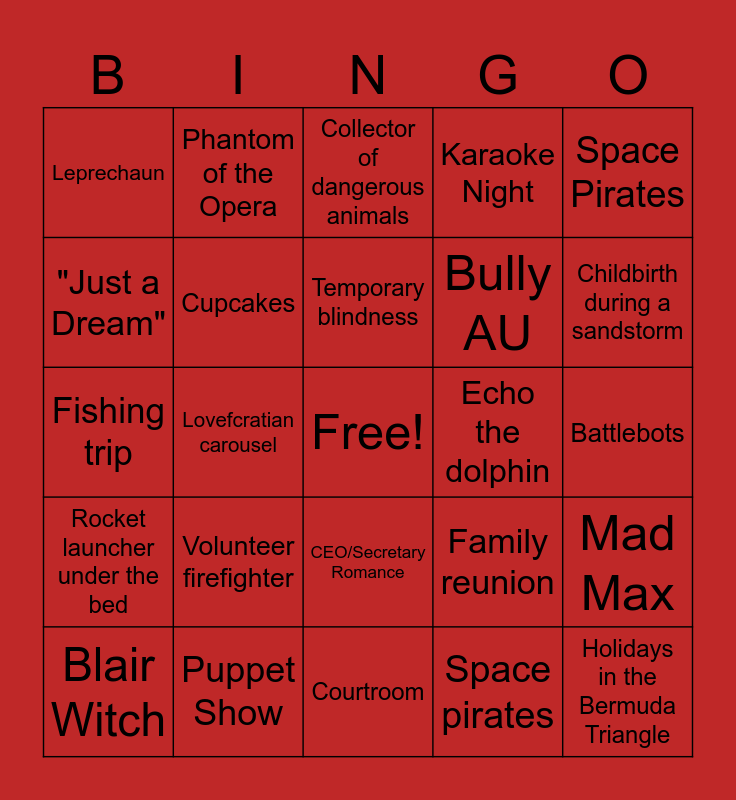 This bingo card has a free space and 24 words: Volunteer firefighter, Puppet Show, Temporary blindness, Blair Witch, Space Pirates, Leprechaun, "Just a Dream", Phantom of the Opera, Echo the dolphin, CEO/Secretary Romance, Bully AU, Fishing trip, Family reunion, Mad Max, Cupcakes, Space pirates, Battlebots, Collector of dangerous animals, Childbirth during a sandstorm, Lovefcratian carousel, Holidays in the Bermuda Triangle, Rocket launcher under the bed, Karaoke Night and Courtroom.