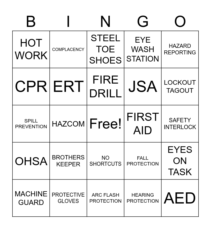 This bingo card has a free space and 49 words: 100% SAFE, AED, ACCIDENT PREVENTION, ARC FLASH PROTECTION, BROTHERS KEEPER, CHEMICAL LABELS, COMPLACENCY, CONFINED SPACE, CPR, EMERGENCY EVACUATION, ERT, EYE WASH STATION, EYES ON TASK, FALL PROTECTION, FIND AND FIX, FIRE ALARM, FIRE DRILL, FIRST AID, FLAMMABLE, HAZARD REPORTING, HAZCOM, HEARING PROTECTION, HOT WORK, JSA, LINE OF FIRE, LOCKOUT TAGOUT, MACHINE GUARD, NEAR MISS REPORTING, NO SHORTCUTS, OHSA, PINCH POINT, PPE, PREFLIGHT CHECKLIST, PROTECTIVE CLOTHING, PROTECTIVE GLOVES, RALLY POINT, SAFETY BARRIER, SAFETY GLASSES, SAFETY INTERLOCK, SAFETY WALK, SDS, SHOCK HAZARD, SLIPS & TRIPS, SPILL CONTAINMENT, SPILL PREVENTION, STEEL TOE SHOES, STOP WORK AUTHORITY, STORM SHELTER and STRUCK BY HAZARD.