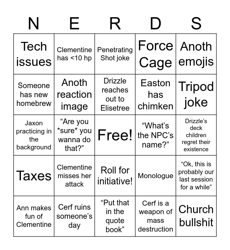 This bingo card has a free space and 24 words: Clementine misses her attack, Cerf ruins someone’s day, Drizzle reaches out to Elisetree, Ann makes fun of Clementine, Anoth emojis, Tech issues, Someone has new homebrew, Clementine has <10 hp, “What’s the NPC’s name?”, Roll for initiative!, Easton has chimken, Jaxon practicing in the background, Monologue, “Ok, this is probably our last session for a while”, Anoth reaction image, Cerf is a weapon of mass destruction, Drizzle’s deck children regret their existence, Penetrating Shot joke, Tripod joke, “Are you *sure* you wanna do that?”, Church bullshit, Taxes, Force Cage and “Put that in the quote book”.
