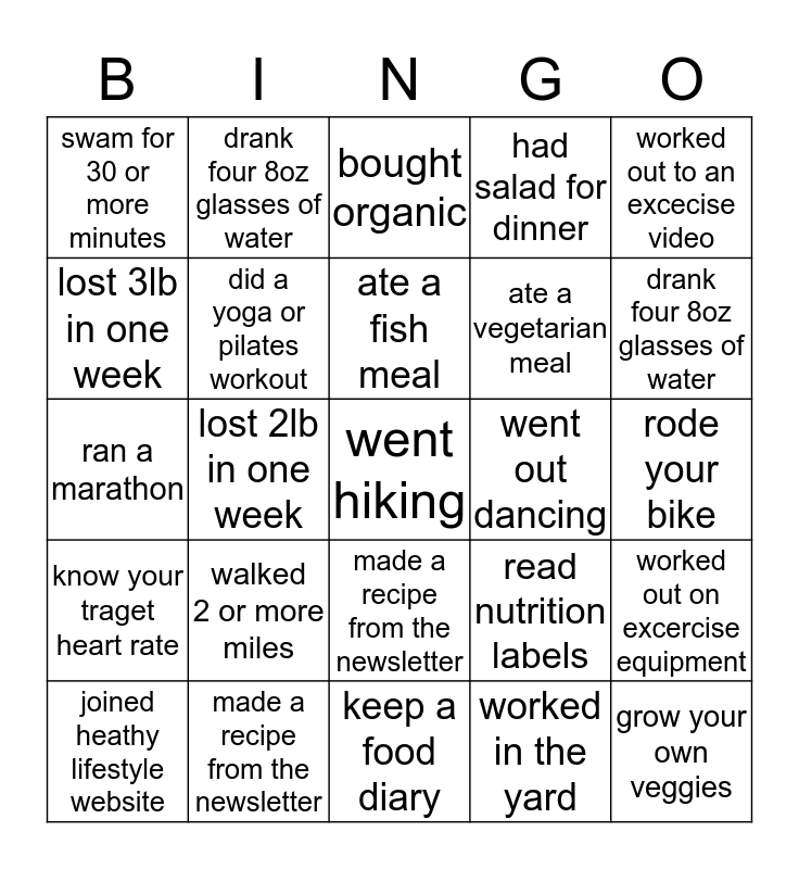 This bingo card has 25 words: walked 2 or more miles, keep a food diary, ate a fish meal, joined heathy lifestyle website, worked out to an excecise video, swam for 30 or more minutes, lost 3lb in one week, drank four 8oz glasses of water, went out dancing, made a recipe from the newsletter, ate a vegetarian meal, ran a marathon, read nutrition labels, worked out on excercise equipment, did a yoga or pilates workout, grow your own veggies, rode your bike, bought organic, drank four 8oz glasses of water, lost 2lb in one week, went hiking, made a recipe from the newsletter, know your traget heart rate, had salad for dinner and worked in the yard.