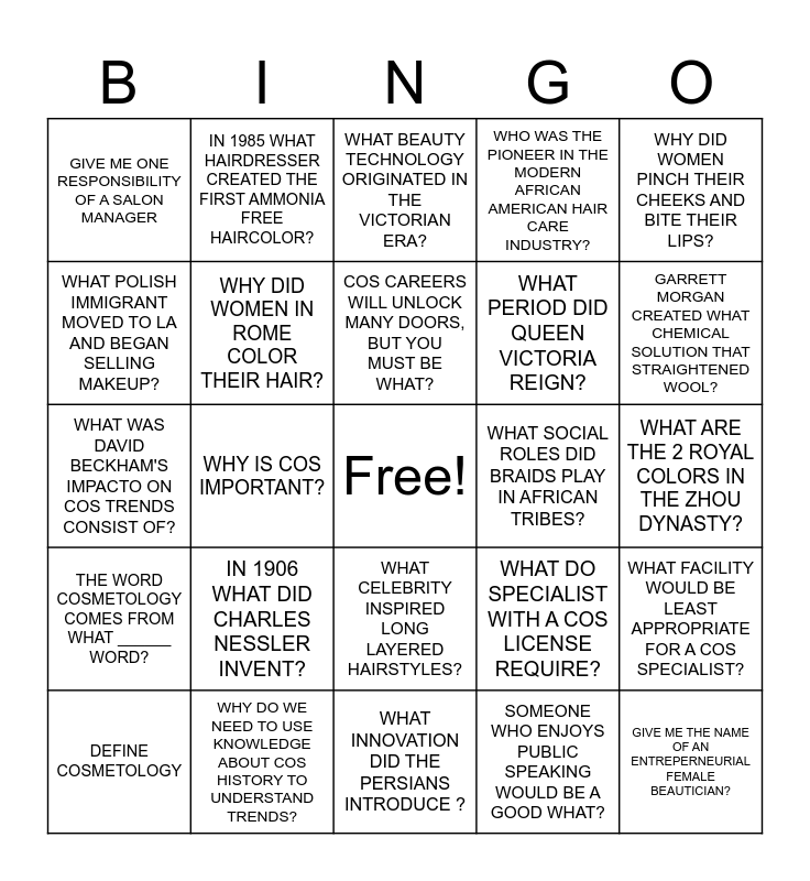 This bingo card has a free space and 29 words: DEFINE COSMETOLOGY, WHAT BEAUTY FASHION WAS POPULAR IN QUEEN ANTOINETTE'S REIGN?, WHY IS COS IMPORTANT?, WHAT ALL DID THE MOTION PICTURE INDUSTRY INSPIRE?, GIVE ME ONE RESPONSIBILITY OF A SALON MANAGER, WHAT BEAUTY TECHNOLOGY ORIGINATED IN THE VICTORIAN ERA?, WHY DID WOMEN IN ROME COLOR THEIR HAIR?, IN 1906 WHAT DID CHARLES NESSLER INVENT?, WHAT SOCIAL ROLES DID BRAIDS PLAY IN AFRICAN TRIBES?, WHY DO WE NEED TO USE KNOWLEDGE ABOUT COS HISTORY TO UNDERSTAND TRENDS?, WHAT ARE THE 2 ROYAL COLORS IN THE ZHOU DYNASTY?, GIVE ME THE NAME OF AN ENTREPERNEURIAL FEMALE BEAUTICIAN?, WHAT INNOVATION DID THE PERSIANS INTRODUCE ?, SOMEONE WHO ENJOYS PUBLIC SPEAKING WOULD BE A GOOD WHAT?, GARRETT MORGAN CREATED WHAT CHEMICAL SOLUTION THAT STRAIGHTENED WOOL?, WHAT DID THE ASSOCIATED MASTER BARBERS AND BEAUTICIANS OF AMERICA ORGANIZE?, WHAT CELEBRITY INSPIRED LONG LAYERED HAIRSTYLES?, THE WORD COSMETOLOGY COMES FROM WHAT ______ WORD?, WHY DID WOMEN PINCH THEIR CHEEKS AND BITE THEIR LIPS?, WHAT WAS DAVID BECKHAM'S IMPACTO ON COS TRENDS CONSIST OF?, WHAT DO SPECIALIST WITH A COS LICENSE REQUIRE?, EGYPTIANS UNFUSE ESSENTIAL OILS FROM WHAT?, WHAT PERIOD DID QUEEN VICTORIA REIGN?, WHAT POLISH IMMIGRANT MOVED TO LA AND BEGAN SELLING MAKEUP?, WHO WAS THE PIONEER IN THE MODERN AFRICAN AMERICAN HAIR CARE INDUSTRY?, IN 1985 WHAT HAIRDRESSER CREATED THE FIRST AMMONIA FREE HAIRCOLOR?, WHAT FACILITY WOULD BE LEAST APPROPRIATE FOR A COS SPECIALIST?, COS CAREERS WILL UNLOCK MANY DOORS, BUT YOU MUST BE WHAT? and GIVE ME 5 CAREERS THAT YOU CAN DO WITH YOUR COS OPERATORS LICENSE.