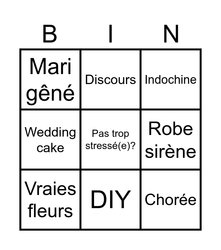 This bingo card has a free space and 8 words: Robe sirène, Indochine, Discours, Vraies fleurs, Mari gêné, Chorée, Wedding cake and DIY.