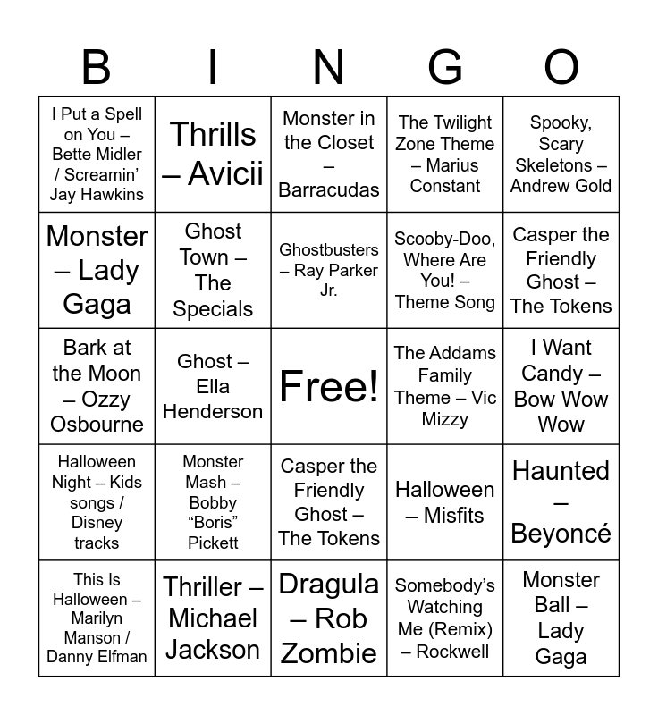 This bingo card has a free space and 24 words: Monster Mash – Bobby “Boris” Pickett, Thriller – Michael Jackson, Ghostbusters – Ray Parker Jr., This Is Halloween – Marilyn Manson / Danny Elfman, Spooky, Scary Skeletons – Andrew Gold, I Put a Spell on You – Bette Midler / Screamin’ Jay Hawkins, Monster – Lady Gaga, Thrills – Avicii, The Addams Family Theme – Vic Mizzy, Casper the Friendly Ghost – The Tokens, Scooby-Doo, Where Are You! – Theme Song, Bark at the Moon – Ozzy Osbourne, Halloween – Misfits, Haunted – Beyoncé, Ghost Town – The Specials, Somebody’s Watching Me (Remix) – Rockwell, I Want Candy – Bow Wow Wow, Monster in the Closet – Barracudas, Casper the Friendly Ghost – The Tokens, Ghost – Ella Henderson, Monster Ball – Lady Gaga, Halloween Night – Kids songs / Disney tracks, The Twilight Zone Theme – Marius Constant and Dragula – Rob Zombie.