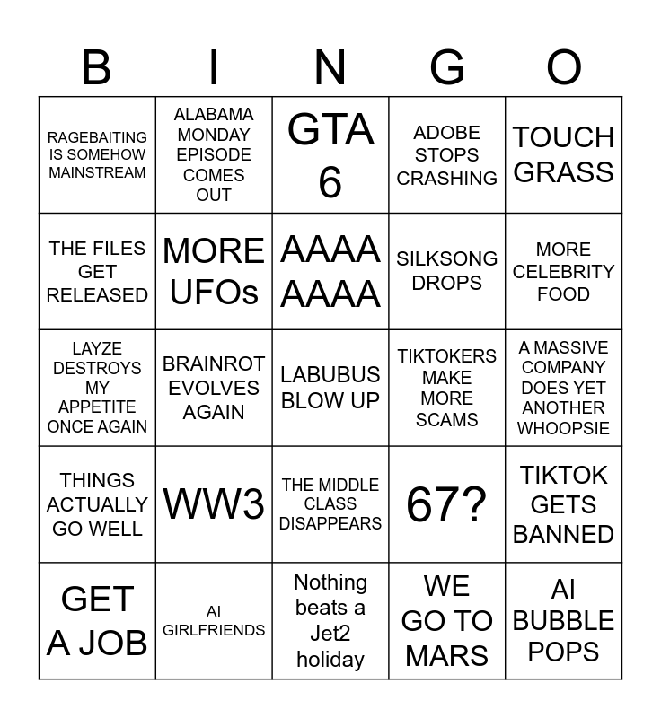 This bingo card has a free space and 24 words: WW3, AI GIRLFRIENDS, AAAA AAAA, GET A JOB, TOUCH GRASS, RAGEBAITING IS SOMEHOW MAINSTREAM, THE FILES GET RELEASED, ALABAMA MONDAY EPISODE COMES OUT, TIKTOKERS MAKE MORE SCAMS, THE MIDDLE CLASS DISAPPEARS, SILKSONG DROPS, LAYZE DESTROYS MY APPETITE ONCE AGAIN, 67?, TIKTOK GETS BANNED, MORE UFOs, WE GO TO MARS, A MASSIVE COMPANY DOES YET ANOTHER WHOOPSIE, GTA 6, MORE CELEBRITY FOOD, BRAINROT EVOLVES AGAIN, AI BUBBLE POPS, THINGS ACTUALLY GO WELL, ADOBE STOPS CRASHING and Nothing beats a Jet2 holiday.