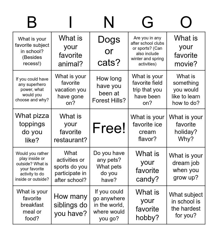 This bingo card has a free space and 24 words: What activities or sports do you participate in after school?, How many siblings do you have?, How long have you been at Forest Hills?, What is your favorite breakfast meal or food?, What is your favorite movie?, What is your favorite subject in school? (Besides recess!), If you could have any superhero power, what would you choose and why?, What is your favorite animal?, What is your favorite ice cream flavor?, Do you have any pets? What pets do you have?, What is your favorite field trip that you have been on?, What pizza toppings do you like?, What is your favorite candy?, What is your dream job when you grow up?, What is your favorite vacation you have gone on?, What is your favorite hobby?, What is your favorite holiday? Why?, Dogs or cats?, What is something you would like to learn how to do?, What is your favorite restaurant?, What subject in school is the hardest for you?, Would you rather play inside or outside? What is your favorite activity to do inside or outside?, Are you in any after school clubs or sports? (Can also include winter and spring activities) and If you could go anywhere in the world, where would you go?.
