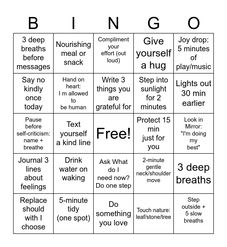 This bingo card has a free space and 24 words: Drink water on waking, 5-minute tidy (one spot), Write 3 things you are grateful for, Replace should with I choose, Joy drop: 5 minutes of play/music, 3 deep breaths before messages, Say no kindly once today, Nourishing meal or snack, Protect 15 min just for you, Ask What do I need now? Do one step, Step into sunlight for 2 minutes, Pause before self-criticism: name + breathe, 2-minute gentle neck/shoulder move, 3 deep breaths, Hand on heart: I m allowed to be human, Touch nature: leaf/stone/tree, Look in Mirror: "I'm doing my best", Compliment your effort (out loud), Lights out 30 min earlier, Text yourself a kind line, Step outside + 5 slow breaths, Journal 3 lines about feelings, Give yourself a hug and Do something you love.
