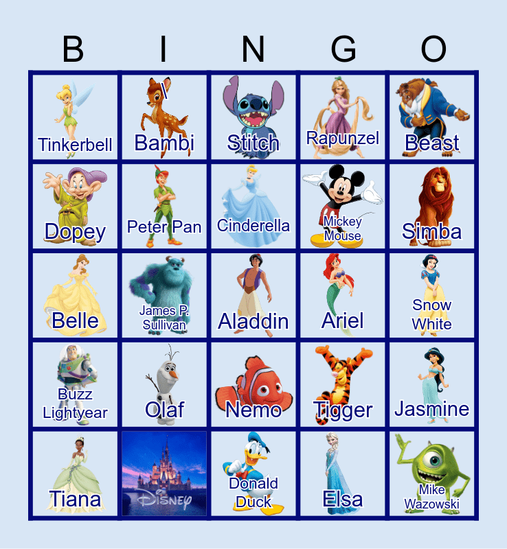 This bingo card has 28 images and 27 words: Jasmine, lightning McQueen, Mickey Mouse, Elsa, Dopey, Stitch, \ Bambi, Buzz Lightyear, Ariel, Tiana, Belle, Rapunzel, Donald Duck, Simba, Woody, Olaf, Peter Pan, Cinderella, Nemo, Tinkerbell, Mike Wazowski, Aladdin, James P. Sullivan, Snow White, Tigger, Beast and Winnie the Pooh.