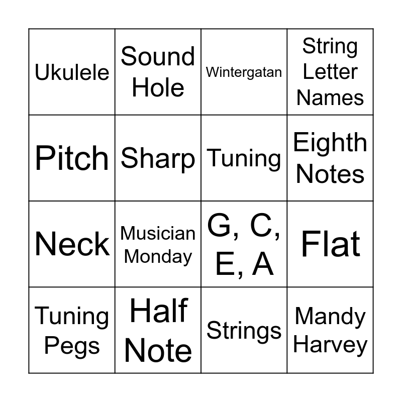 This bingo card has 18 words: Musician Monday, Mandy Harvey, Wintergatan, Ukulele, G, C, E, A, String Letter Names, Tuning Pegs, Sound Hole, Eighth Notes, Neck, Strings, Pitch, Flat, Sharp, Tuning, Quarter Note, Half Note and Quarter Note Rest.