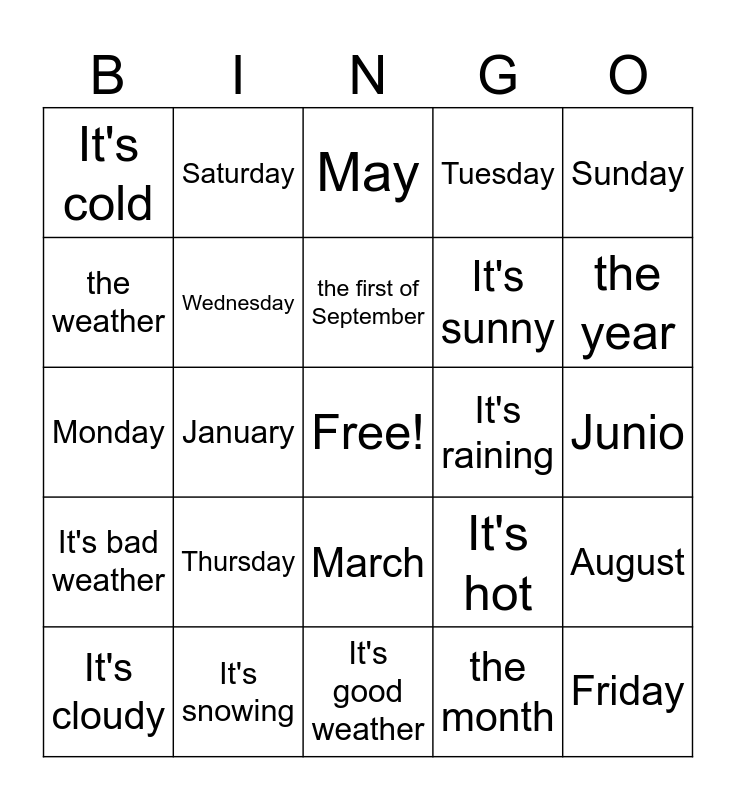 This bingo card has a free space and 29 words: It's cloudy, Monday, January, It's windy, It's cold, May, Wednesday, Thursday, It's raining, It's snowing, Junio, Friday, It's good weather, the month, the year, the week, March, It's bad weather, Sunday, Monday, It's hot, ¿Qué tiempo hace hoy?, It's sunny, the weather, Tuesday, Saturday, August, the first of September and There's a storm.