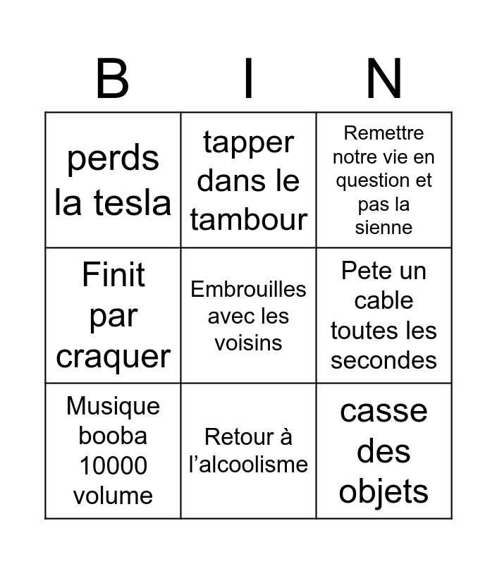 This bingo card has a free space and 8 words: Pete un cable toutes les secondes, Remettre notre vie en question et pas la sienne, tapper dans le tambour, Musique booba 10000 volume, perds la tesla, casse des objets, Finit par craquer and Retour à l’alcoolisme.