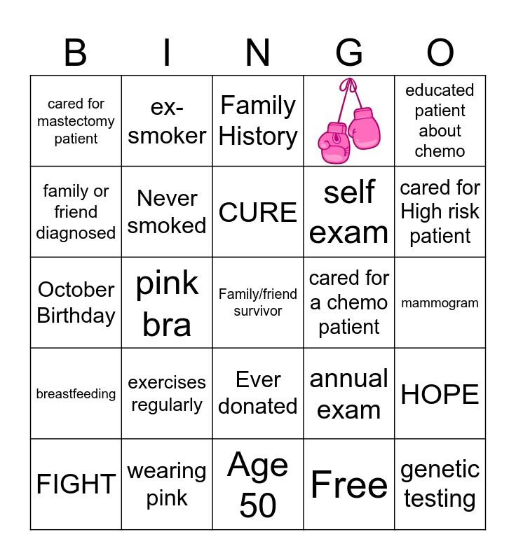 This bingo card has 2 images and 28 words: wearing pink, Educated patient about breast cancer, pink bra, done a breast cancer walk, cared for mastectomy patient, Family History, Never smoked, Ever donated, cared for a chemo patient, Age 50, mammogram, Family/friend survivor, Free, genetic testing, cared for High risk patient, Free, annual exam, breastfeeding, exercises regularly, educated patient about chemo, October Birthday, recent mammogram, ex-smoker, self exam, family or friend diagnosed, HOPE, FIGHT and CURE.