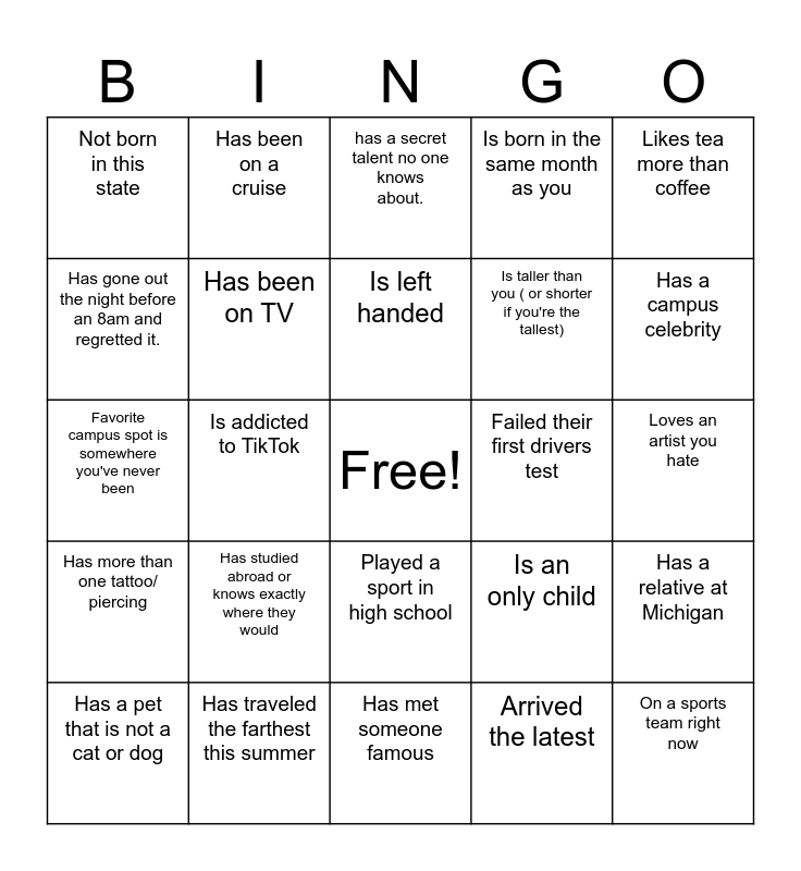 This bingo card has a free space and 24 words: Has studied abroad or knows exactly where they would, Has traveled the farthest this summer, Is left handed, Has a pet that is not a cat or dog, Likes tea more than coffee, Not born in this state, Has gone out the night before an 8am and regretted it., Has been on a cruise, Failed their first drivers test, Played a sport in high school, Is taller than you ( or shorter if you're the tallest), Favorite campus spot is somewhere you've never been, Is an only child, Has a relative at Michigan, Has been on TV, Arrived the latest, Loves an artist you hate, has a secret talent no one knows about., Has a campus celebrity, Is addicted to TikTok, On a sports team right now, Has more than one tattoo/ piercing, Is born in the same month as you and Has met someone famous.