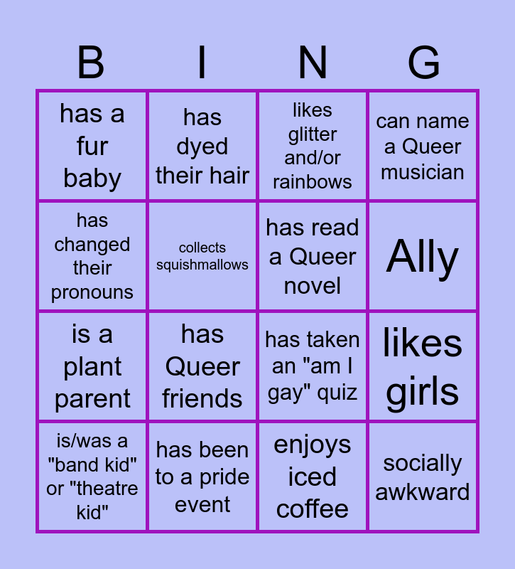 This bingo card has 16 words: has been to a pride event, likes girls, likes glitter and/or rainbows, has a fur baby, is a plant parent, has dyed their hair, has taken an "am I gay" quiz, enjoys iced coffee, has changed their pronouns, collects squishmallows, is/was a "band kid" or "theatre kid", can name a Queer musician, has Queer friends, Ally, has read a Queer novel and socially awkward.