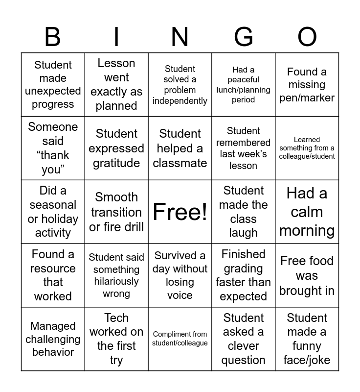This bingo card has a free space and 24 words: Student said something hilariously wrong, Tech worked on the first try, Student helped a classmate, Managed challenging behavior, Found a missing pen/marker, Student made unexpected progress, Someone said “thank you”, Lesson went exactly as planned, Student made the class laugh, Survived a day without losing voice, Student remembered last week’s lesson, Did a seasonal or holiday activity, Finished grading faster than expected, Free food was brought in, Student expressed gratitude, Student asked a clever question, Had a calm morning, Student solved a problem independently, Learned something from a colleague/student, Smooth transition or fire drill, Student made a funny face/joke, Found a resource that worked, Had a peaceful lunch/planning period and Compliment from student/colleague.