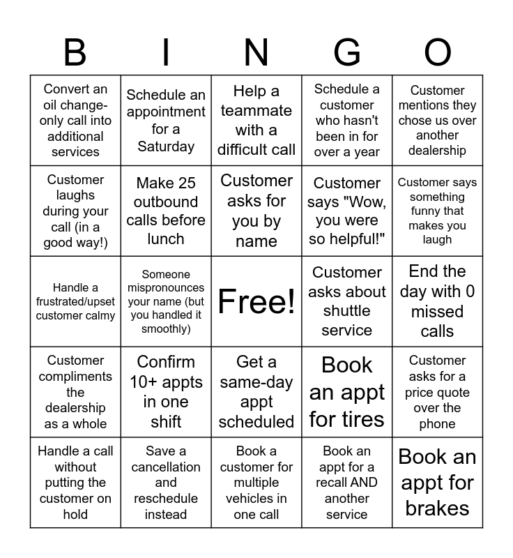 This bingo card has a free space and 24 words: Confirm 10+ appts in one shift, Save a cancellation and reschedule instead, Customer asks for you by name, Handle a call without putting the customer on hold, Customer mentions they chose us over another dealership, Convert an oil change-only call into additional services, Customer laughs during your call (in a good way!), Schedule an appointment for a Saturday, Customer asks about shuttle service, Get a same-day appt scheduled, Customer says "Wow, you were so helpful!", Handle a frustrated/upset customer calmy, Book an appt for tires, Customer asks for a price quote over the phone, Make 25 outbound calls before lunch, Book an appt for a recall AND another service, End the day with 0 missed calls, Help a teammate with a difficult call, Customer says something funny that makes you laugh, Someone mispronounces your name (but you handled it smoothly), Book an appt for brakes, Customer compliments the dealership as a whole, Schedule a customer who hasn't been in for over a year and Book a customer for multiple vehicles in one call.