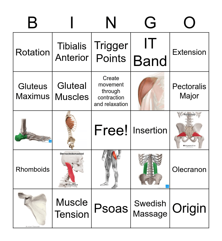 This bingo card has 13 images, a free space and 26 words: Flexion, Scalenes, Gastrocnemius, Gluteal Muscles, Create movement through contraction and relaxation, Extension, Rhomboids, IT Band, Origin, Insertion, Masseter, Rotation, Abdominal Muscles, Gluteus Maximus, Psoas, Pectoralis Major, Bony Landmarks, Gluteus Minimus, Hip Flexion, Tibialis Anterior, Temporalis, Trigger Points, Muscle Tension, Swedish Massage, Condyle and Olecranon.