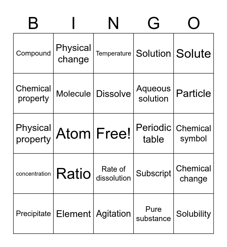 This bingo card has a free space and 30 words: Element, Surface area, Atom, Dissolution, Compound, Temperature, Molecule, Rate of dissolution, Periodic table, Agitation, Chemical symbol, Solubility, Pure substance, Saturated solution, Particle, Dilution, Subscript, concentration, Ratio, Solute, Physical property, Solvent, Physical change, Aqueous solution, Chemical property, Solution, Chemical change, Precipitate, Dissolve and Chemical formula.