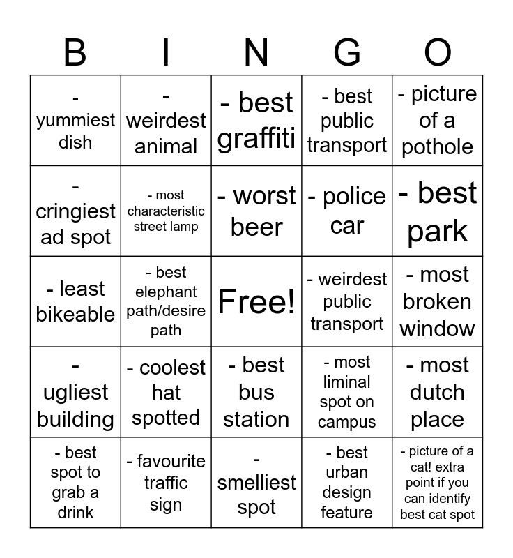 This bingo card has a free space and 45 words: - a picture of a good tree you see, - picture of a cat! extra point if you can identify best cat spot, - your favourite lamp at your accommodation, - best spot to grab a drink, - best spot to chill with a book, - best urban design feature, - best graffiti, - worst graffiti, - picture of a pothole, - favourite traffic sign, - best public transport, - weirdest public transport, - best bus station, - coolest hat spotted, - best panorama view, - smelliest spot, - most bikeable spot, - least bikeable, - best flea market, - best park, - weirdest animal, - ugliest pigeon (NOT MY IDEA), - most polite duck, - yummiest dish, - least yummy dish, - most broken window, - most squattable place, - best classroom on campus, - most liminal spot on campus, - ugliest building, - most french place, - most dutch place, - most berlin place, - place where you heard or encountered dutch, - water fountain, - best elephant path/desire path, - most sus (sussest) spot, - most communist place, - least communist place, - worst beer, - cringiest ad spot, - police car, - most chaotic video, - most characteristic street lamp and - best street.