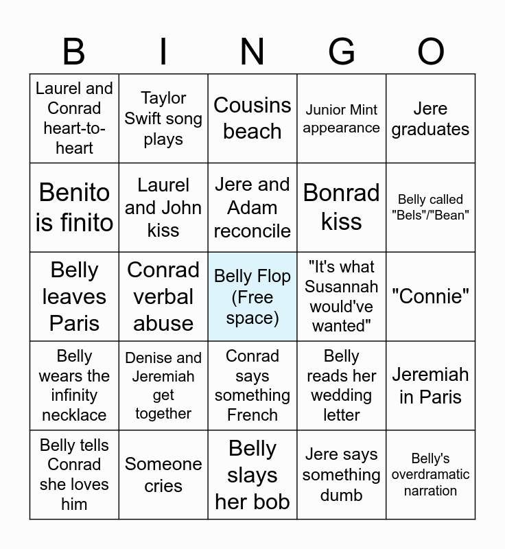 This bingo card has a free space and 27 words: Belly reads her wedding letter, Susannah flashback, Bonrad kiss, Belly slays her bob, Benito is finito, Cousins beach, Taylor Swift song plays, Belly wears the infinity necklace, "It's what Susannah would've wanted", Jeremiah in Paris, Belly leaves Paris, Junior Mint appearance, Belly tells Conrad she loves him, Someone cries, Belly called "Bels"/"Bean", Jeremiah and Conrad fight, Laurel and John kiss, Jere and Adam reconcile, Denise and Jeremiah get together, Laurel and Conrad heart-to-heart, "Connie", Jere says something dumb, Conrad verbal abuse, Belly's overdramatic narration, Conrad says something French, Jere graduates and Conrad and Belly meet in Paris.