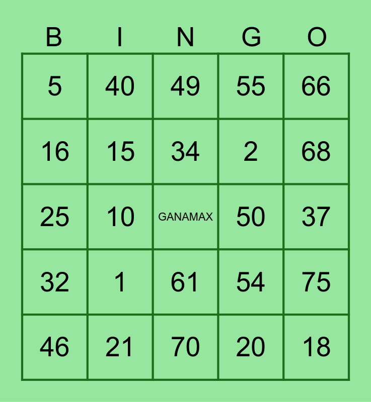 This bingo card has a free space and 24 words: 1, 21, 34, 46, 66, 5, 16, 40, 50, 61, 2, 25, 54, 75, 15, 20, 37, 49, 68, 10, 18, 32, 55 and 70.