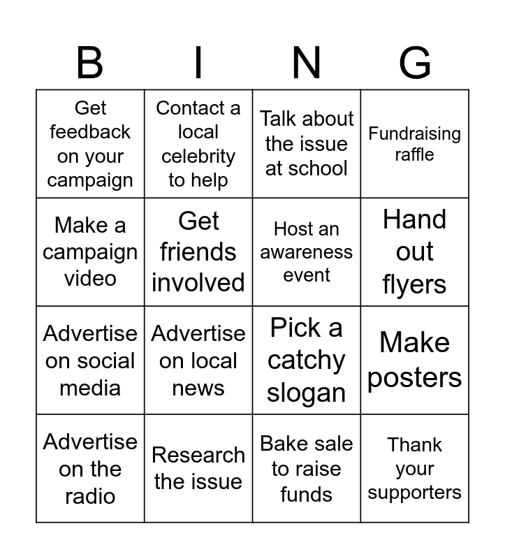 This bingo card has 16 words: Research the issue, Make posters, Talk about the issue at school, Get feedback on your campaign, Advertise on social media, Contact a local celebrity to help, Pick a catchy slogan, Bake sale to raise funds, Make a campaign video, Get friends involved, Advertise on the radio, Fundraising raffle, Advertise on local news, Hand out flyers, Host an awareness event and Thank your supporters.