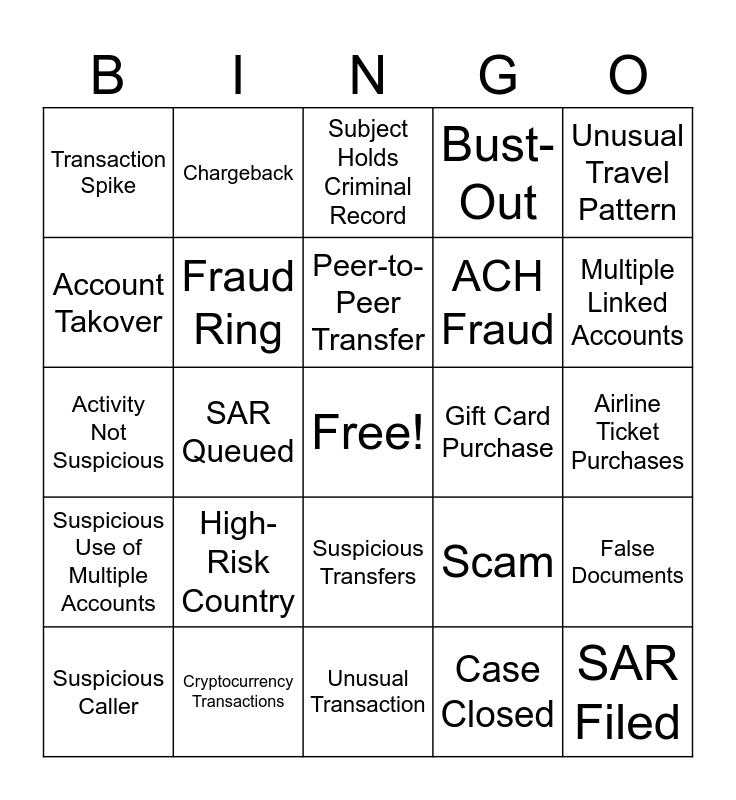 This bingo card has a free space and 49 words: Suspicious Activity, SAR Filed, Red Flag, Unusual Transaction, High-Risk Country, Synthetic Identity, Chargeback, Charged-Off Account, Account Takover, ID Theft, Fraud Ring, Bust-Out, False Documents, Scam, Rapid Movement of Funds, Unusual IPs, Peer-to-Peer Transfer, Gift Card Purchase, Crypto, Unusual Travel Pattern, SAR Queued, Case Closed, Transaction Spike, ACH Fraud, Large Cash Withdrawal, Multiple Linked Accounts, Suspicious Caller, Fraudulent Application, Suspicious Transfers, Suspicious Use of Multiple Accounts, Elder Financial Abuse, Human Trafficking, NSF Payment, Customer Advised Not Authorized Payment, Cryptocurrency Transactions, Authorized User on the Account, Debit Card Fraud, Acount Frozen Payment, Airline Ticket Purchases, No Account/Unable to Locate Account Payment, SAR Reviewed, Under-Limit, No Subject, Stolen Card, Activity Not Suspicious, Subject Holds Criminal Record, 4+ Bank Accounts utilized, Cash Advance and P.O. Box.