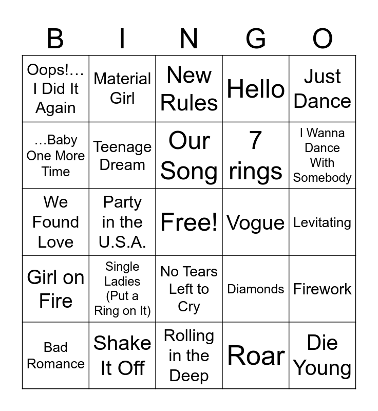 This bingo card has a free space and 24 words: Single Ladies (Put a Ring on It), Shake It Off, Our Song, Bad Romance, Just Dance, Oops!… I Did It Again, …Baby One More Time, Material Girl, Vogue, No Tears Left to Cry, 7 rings, We Found Love, Diamonds, Firework, Teenage Dream, Roar, Levitating, New Rules, I Wanna Dance With Somebody, Party in the U.S.A., Die Young, Girl on Fire, Hello and Rolling in the Deep.