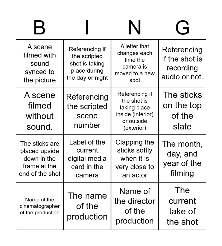 This bingo card has 16 words: The name of the production, The month, day, and year of the filming, A letter that changes each time the camera is moved to a new spot, A scene filmed with sound synced to the picture, The sticks are placed upside down in the frame at the end of the shot, Referencing if the scripted shot is taking place during the day or night, Clapping the sticks softly when it is very close to an actor, Name of the director of the production, A scene filmed without sound., Referencing the scripted scene number, Name of the cinematographer of the production, Referencing if the shot is recording audio or not., Label of the current digital media card in the camera, The sticks on the top of the slate, Referencing if the shot is taking place inside (interior) or outside (exterior) and The current take of the shot.