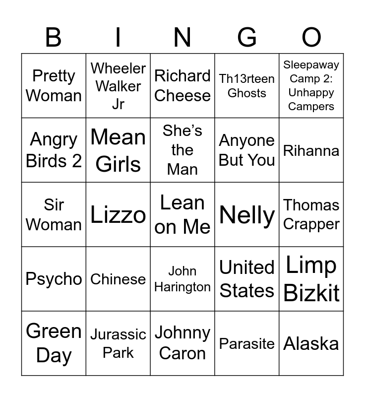This bingo card has 60 words: Austin Powers Man of Mystery, Jurassic Park, Dumb and Dumber, Psycho, Parasite, Saw, Mean Girls, The Hangover, Anyone But You, Bridesmaids, Th13rteen Ghosts, The Menu, Angry Birds 2, Harry Potter and the Goblet of Fire, A Quiet Place, Pretty Woman, Lean on Me, Sleepaway Camp 2: Unhappy Campers, American Pie, She’s the Man, Nelly, Richard Cheese, Green Day, Limp Bizkit, Eminem, Rage Against the Machine, Eric Cartman, Hollywood Undead, Rihanna, Bo Burnham, CeeLo Green, Peaches, Adam Green, Pixies, Wheeler Walker Jr, Hypnotize Camp Posse, Blink-182, Lizzo, Megan Thee Stallion, Sir Woman, November 19, Chinese, Thomas Crapper, E flat, United States, 1890, Floating Toilet, John Quincy Adams, Corn cobs, John Harington, Johnny Caron, Myth Busters, The International Space Station, Leave it to Beaver, 2500, 50, Stove Maker, 76, Alaska and 6500.
