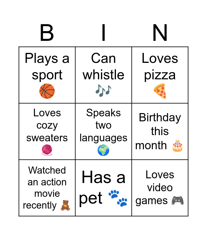 This bingo card has 10 words: Has a pet ๐พ, Loves pizza ๐, Plays a sport ๐, Speaks two languages ๐, Loves cozy sweaters ๐งถ, Watched an action movie recently ๐งธ, Can whistle ๐ถ, Wears glasses ๐, Birthday this month ๐ and Loves video games ๐ฎ.