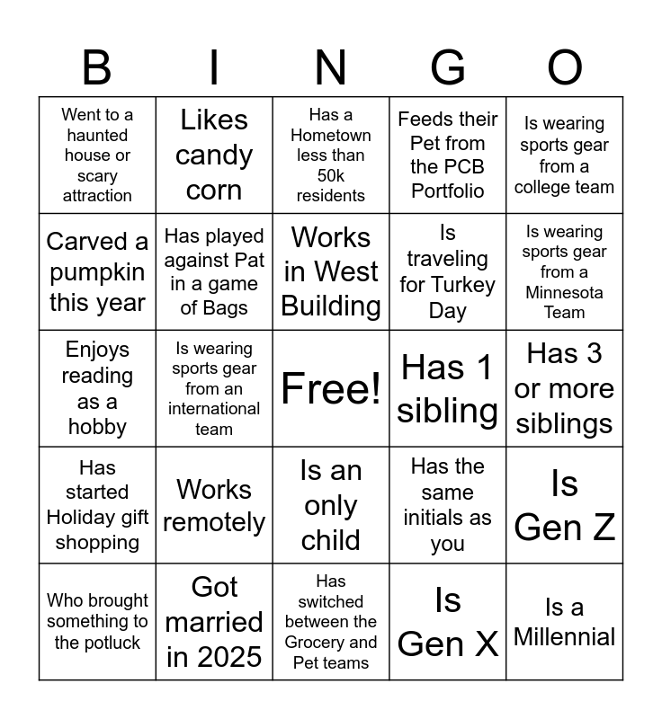 This bingo card has a free space and 42 words: Works at POLAR, Works in West Building, Works in East Building, Works remotely, Is Gen X, Is Gen Z, Is a Millennial, Has a Hometown not in Minnesota, Has a Hometown less than 50k residents, Is an only child, Has 3 or more siblings, Is wearing sports gear from a Minnesota Team, Is wearing sports gear from an international team, Is wearing sports gear from a college team, Enjoys a sport for a hobby, Has the same initials as you, Thinks fall is the best season, Enjoys reading as a hobby, Went to a pumpkin patch this year, Likes candy corn, Carved a pumpkin this year, Made pumpkin bread this fall, Went apple picking, Went to a haunted house or scary attraction, Is participating in Movember, Plans to go hunting, Is traveling for Turkey Day, Has been with PCB for over 10 years, Has been with PCB for less than 1 year, Has a dog, Has a cat, Has started Holiday gift shopping, Has played against Pat in a game of Bags, Has switched between the Grocery and Pet teams, Had a Halloween Costume with a PCB connection, Who brought something to the potluck, Got married in 2025, Has 1 sibling, Has 2 siblings, Speaks a language other than English, Feeds their Pet from the PCB Portfolio and Eats Post Cereal at least once a week at home.