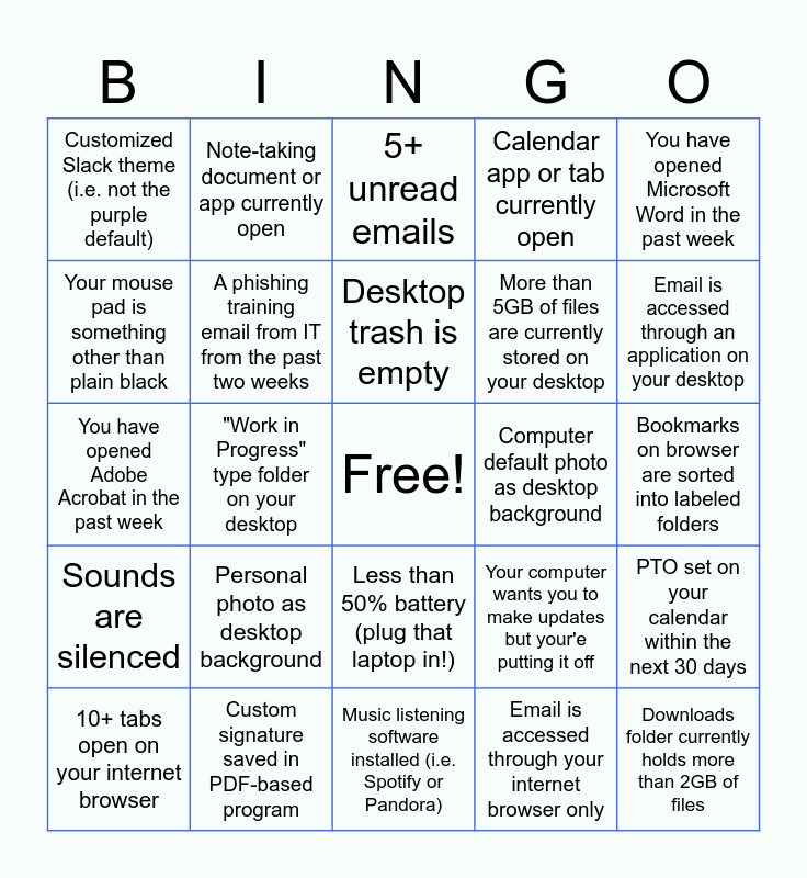 This bingo card has a free space and 29 words: 10+ tabs open on your internet browser, 5+ programs open, "Work in Progress" type folder on your desktop, 5+ unread Slack notifications, Customized Slack theme (i.e. not the purple default), 5+ unread emails, A phishing training email from IT from the past two weeks, Personal photo as desktop background, Computer default photo as desktop background, Custom signature saved in PDF-based program, Bookmarks on browser are sorted into labeled folders, Downloads folder currently holds more than 2GB of files, Music listening software installed (i.e. Spotify or Pandora), Email is accessed through your internet browser only, Email is accessed through an application on your desktop, Laptop or keyboard cover/case, Less than 50% battery (plug that laptop in!), Sounds are silenced, You have opened Microsoft Word in the past week, You have opened Adobe Acrobat in the past week, Your computer wants you to make updates but your'e putting it off, External hard drive attached for working files, More than 5GB of files are currently stored on your desktop, Your mouse pad is something other than plain black, Calendar app or tab currently open, Note-taking document or app currently open, PTO set on your calendar within the next 30 days, Desktop trash is empty and You use a browser that isn't Google Chrome.