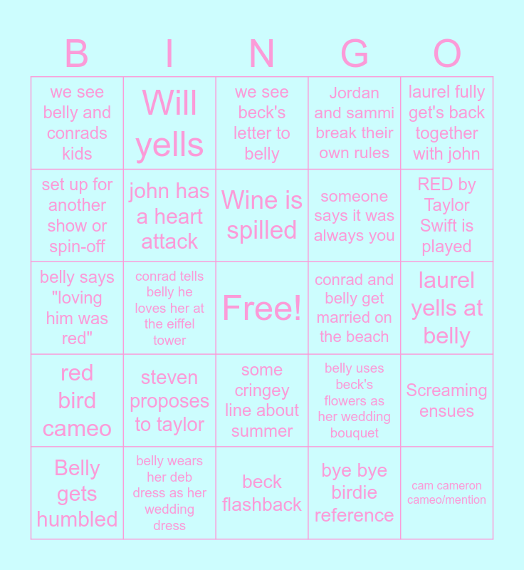 This bingo card has a free space and 29 words: Belly gets humbled, jeremiah ends up with denise, conrad tells belly he loves her at the eiffel tower, flash forward to belly and conrads wedding, we see belly and conrads kids, we see beck's letter to belly, john has a heart attack, steven proposes to taylor, conrad and belly get married on the beach, belly wears her deb dress as her wedding dress, laurel yells at belly, cam cameron cameo/mention, beck flashback, bye bye birdie reference, RED by Taylor Swift is played, any taylor swift song, some cringey line about summer, red bird cameo, laurel fully get's back together with john, belly says "loving him was red", belly uses beck's flowers as her wedding bouquet, conrad wines and throughs a fit, someone says it was always you, set up for another show or spin-off, Jordan and sammi break their own rules, Will yells, Screaming ensues, Wine is spilled and Rewinding of episode.