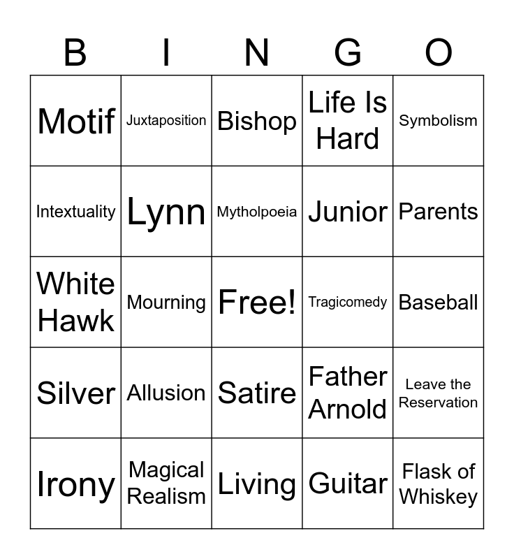 This bingo card has a free space and 24 words: Allusion, Magical Realism, Mytholpoeia, Irony, Symbolism, Motif, Intextuality, Juxtaposition, Tragicomedy, Satire, Junior, White Hawk, Father Arnold, Leave the Reservation, Lynn, Guitar, Baseball, Bishop, Parents, Mourning, Flask of Whiskey, Silver, Life Is Hard and Living.
