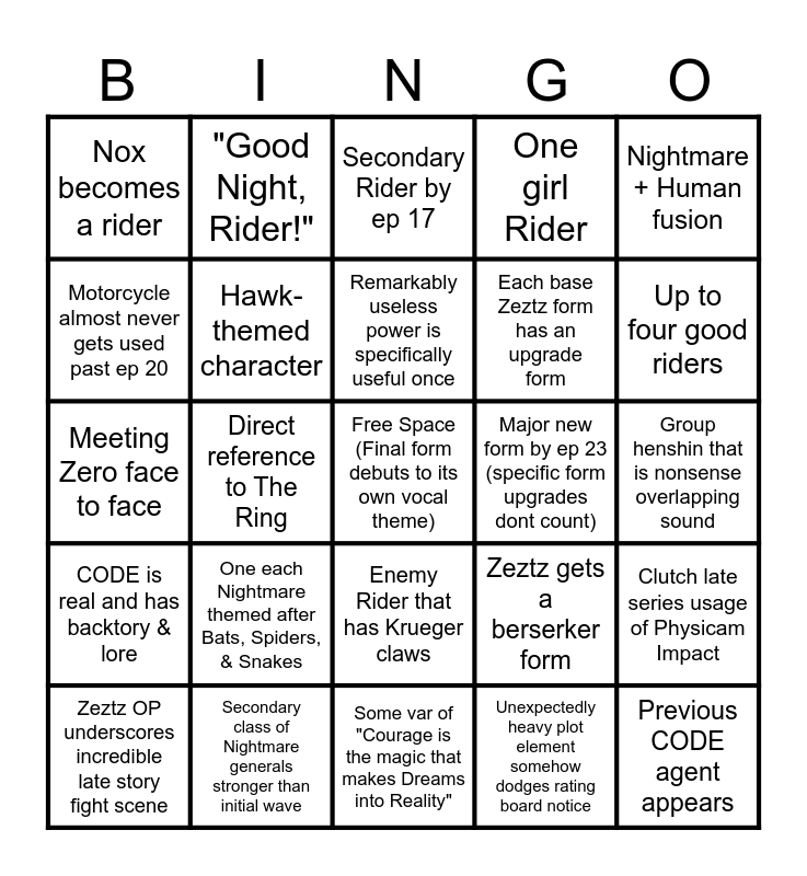 This bingo card has a free space and 24 words: One each Nightmare themed after Bats, Spiders, & Snakes, Secondary class of Nightmare generals stronger than initial wave, Remarkably useless power is specifically useful once, Zeztz OP underscores incredible late story fight scene, Nightmare + Human fusion, Nox becomes a rider, Motorcycle almost never gets used past ep 20, "Good Night, Rider!", Major new form by ep 23 (specific form upgrades dont count), Enemy Rider that has Krueger claws, Each base Zeztz form has an upgrade form, Meeting Zero face to face, Zeztz gets a berserker form, Clutch late series usage of Physicam Impact, Hawk-themed character, Unexpectedly heavy plot element somehow dodges rating board notice, Group henshin that is nonsense overlapping sound, Secondary Rider by ep 17, Up to four good riders, Direct reference to The Ring, Previous CODE agent appears, CODE is real and has backtory & lore, One girl Rider and Some var of "Courage is the magic that makes Dreams into Reality".