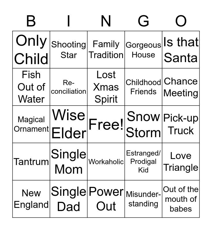 This bingo card has a free space and 24 words: Single Mom, Single Dad, Lost Xmas Spirit, New England, Is that Santa, Only Child, Fish Out of Water, Shooting Star, Snow Storm, Workaholic, Childhood Friends, Magical Ornament, Estranged/ Prodigal Kid, Love Triangle, Re-conciliation, Misunder-standing, Pick-up Truck, Family Tradition, Chance Meeting, Wise Elder, Out of the mouth of babes, Tantrum, Gorgeous House and Power Out.