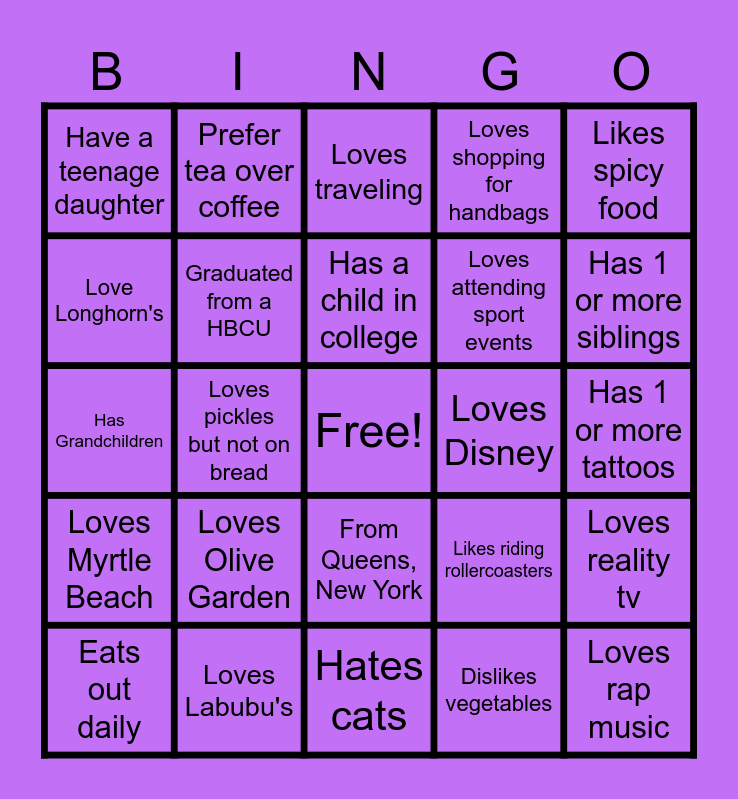 This bingo card has a free space and 24 words: Loves Olive Garden, Loves Labubu's, Has a child in college, Eats out daily, Likes spicy food, Have a teenage daughter, Love Longhorn's, Prefer tea over coffee, Loves Disney, From Queens, New York, Loves attending sport events, Has Grandchildren, Likes riding rollercoasters, Loves reality tv, Graduated from a HBCU, Dislikes vegetables, Has 1 or more tattoos, Loves traveling, Has 1 or more siblings, Loves pickles but not on bread, Loves rap music, Loves Myrtle Beach, Loves shopping for handbags and Hates cats.