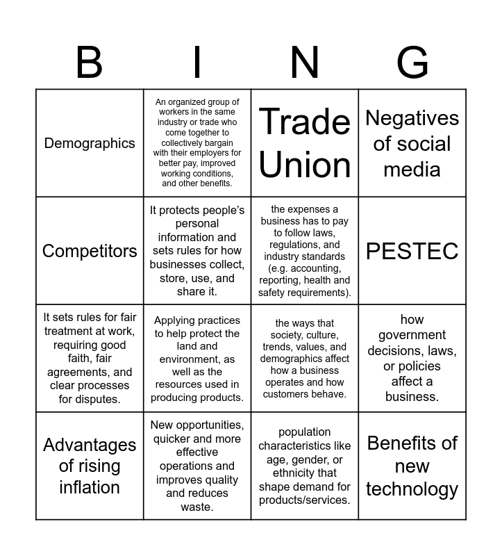 This bingo card has 27 words: Free!, Employee Relations Act, It sets rules for fair treatment at work, requiring good faith, fair agreements, and clear processes for disputes., Privacy Act, It protects people’s personal information and sets rules for how businesses collect, store, use, and share it., Trade Union, An organized group of workers in the same industry or trade who come together to collectively bargain with their employers for better pay, improved working conditions, and other benefits., Benefits of new technology, New opportunities, quicker and more effective operations and improves quality and reduces waste., Social influences, the ways that society, culture, trends, values, and demographics affect how a business operates and how customers behave., Negatives of social media, bad publicity spreading quickly, negative customer reviews damaging reputation, or time and money being wasted if not managed well., Resource management act, Applying practices to help protect the land and environment, as well as the resources used in producing products., Compliance costs, the expenses a business has to pay to follow laws, regulations, and industry standards (e.g. accounting, reporting, health and safety requirements)., PESTEC, Political, Economic, Social, Technological, Environmental, Competitive, Demographics, population characteristics like age, gender, or ethnicity that shape demand for products/services., Political factors, how government decisions, laws, or policies affect a business., Advantages of rising inflation, can reduce debt value, increase wages, prevent deflation, and boost government revenue, Competitors and other businesses that sell similar products or services and try to win the same customers..