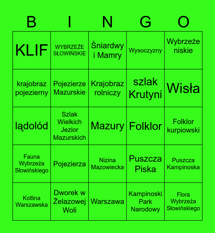 This bingo card has 25 words: Pojezierza, Warszawa, Krajobraz rolniczy, Kotlina Warszawska, Wybrzeże niskie, KLIF, krajobraz pojezierny, WYBRZEŻE SŁOWIŃSKIE, Folklor, Nizina Mazowiecka, szlak Krutyni, lądolód, Puszcza Piska, Puszcza Kampinoska, Pojezierze Mazurskie, Flora Wybrzeża Słowińskiego, Folklor kurpiowski, Śniardwy i Mamry, Wisła, Szlak Wielkich Jezior Mazurskich, Mazury, Dworek w Żelazowej Woli, Fauna Wybrzeża Słowińskiego, Wysoczyzny and Kampinoski Park Narodowy.