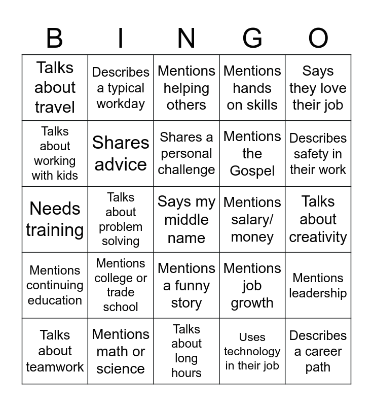 This bingo card has a free space and 24 words: Talks about teamwork, Mentions college or trade school, Shares a personal challenge, Uses technology in their job, Says they love their job, Talks about travel, Describes a typical workday, Mentions helping others, Mentions salary/ money, Talks about creativity, Needs training, Shares advice, Mentions job growth, Mentions leadership, Talks about working with kids, Mentions math or science, Talks about long hours, Mentions hands on skills, Describes safety in their work, Mentions continuing education, Talks about problem solving, Mentions a funny story, Mentions the Gospel and Describes a career path.
