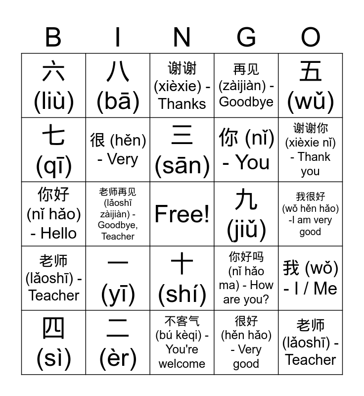 This bingo card has a free space and 24 words: 一 (yī), 二 (èr), 三 (sān), 四 (sì), 五 (wǔ), 六 (liù), 七 (qī), 八 (bā), 九 (jiǔ), 十 (shí), 你 (nǐ) - You, 你好 (nǐ hǎo) - Hello, 你好吗 (nǐ hǎo ma) - How are you?, 我 (wǒ) - I / Me, 很 (hěn) - Very, 很好 (hěn hǎo) - Very good, 我很好 (wǒ hěn hǎo) -I am very good, 谢谢 (xièxie) - Thanks, 谢谢你 (xièxie nǐ) - Thank you, 老师再见 (lǎoshī zàijiàn) - Goodbye, Teacher, 老师 (lǎoshī) - Teacher, 老师 (lǎoshī) - Teacher, 再见 (zàijiàn) - Goodbye and 不客气 (bú kèqi) - You're welcome.