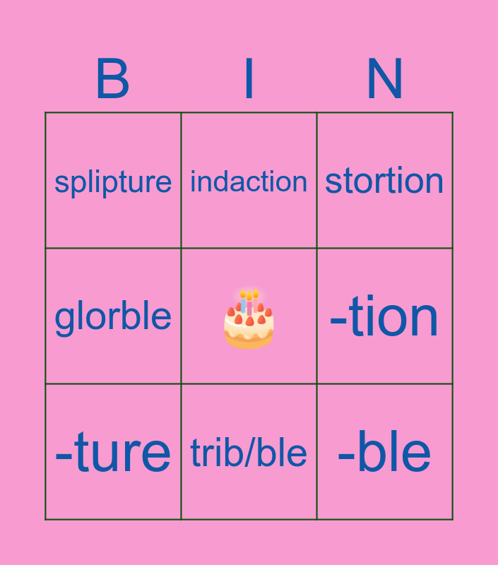 This bingo card has a free space and 8 words: -tion, stortion, indaction, -ture, splipture, -ble, glorble and trib/ble.