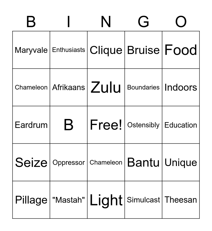 This bingo card has a free space and 28 words: Unique, Bereaved, Boundaries, Simulcast, Chameleon, Clique, Enthusiasts, Seize, Ostensibly, Pillage, Eardrum, Bruise, "Mastah", Light, Indoors, Languages, Oppressor, Afrikaans, Zulu, Chameleon, Maryvale, White, Theesan, B, Education, Bantu, Food and Trevor.