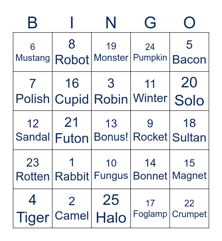 This bingo card has a free space and 24 words: 1 Rabbit, 2 Camel, 3 Robin, 4 Tiger, 5 Bacon, 6 Mustang, 7 Polish, 8 Robot, 9 Rocket, 10 Fungus, 11 Winter, 12 Sandal, 14 Bonnet, 15 Magnet, 16 Cupid, 17 Foglamp, 18 Sultan, 19 Monster, 20 Solo, 21 Futon, 22 Crumpet, 23 Rotten, 24 Pumpkin and 25 Halo.